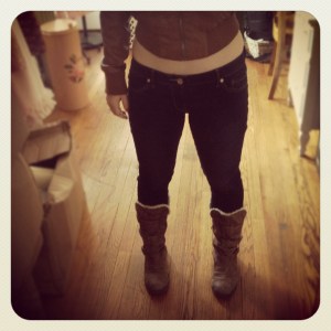 Below shows the highest I could pull up my pants and the lowest I could pull down my jacket. When I walked, however, it definitely didn’t stay this close together and most of my midriff was showing. When I walked outside in the 40 degree weather to find my car, I was getting quite a number of looks with my attire and especially with the bottom of my rib tattoo sticking out on the right side. hah. Classy.