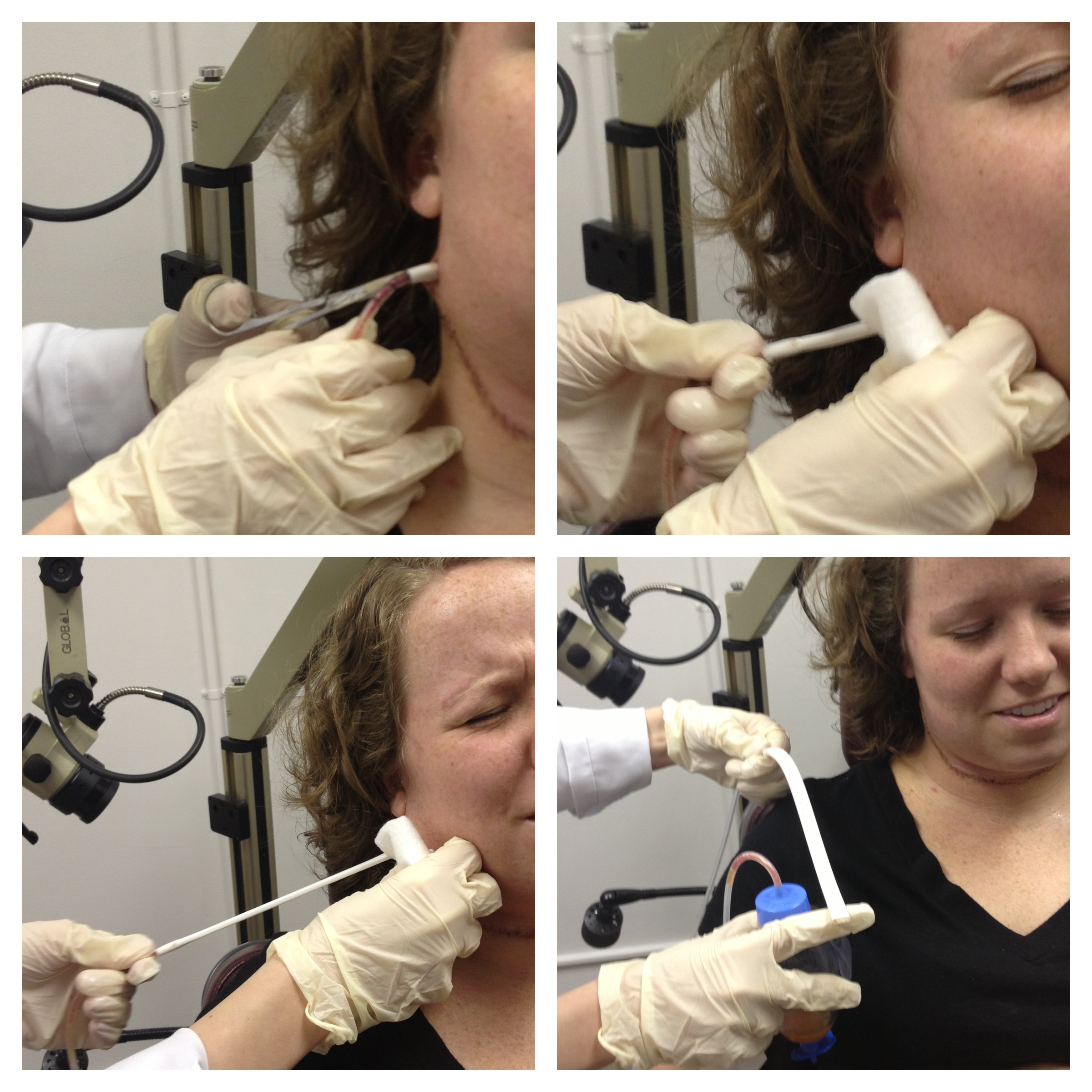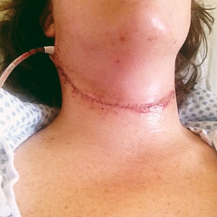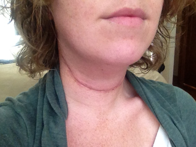 After my first surgery, they sent me home the second day with heavy bandaging on my neck and nothing else. This time, I went home after three days with no bandaging, and I had a drain in my neck for five days. While it was bizarre to have to drain a bottle of liquid from my neck several times a day, it is clear that my incision is healing much better and with a much slimmer line than last time. It was also much more comfortable not having thick bandaging to deal with.