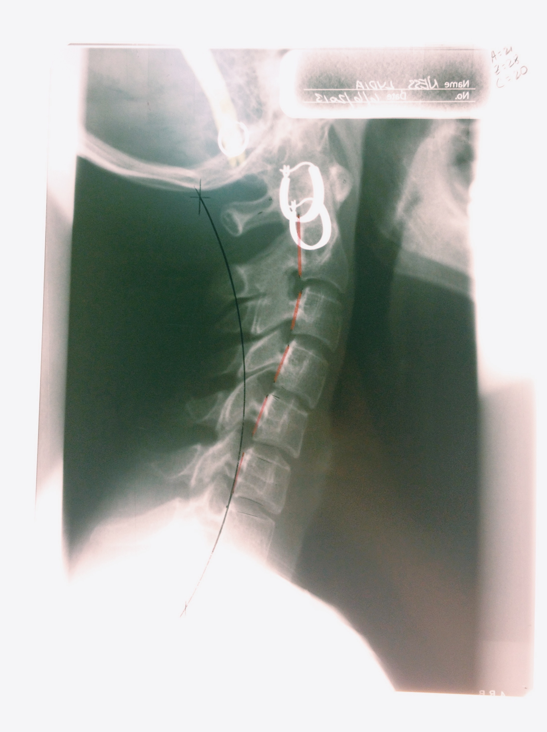 The black line is a normal spinal curve, the red line is mine. Two of the vertebra are already fused in the back.