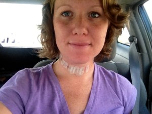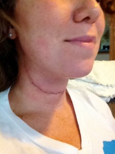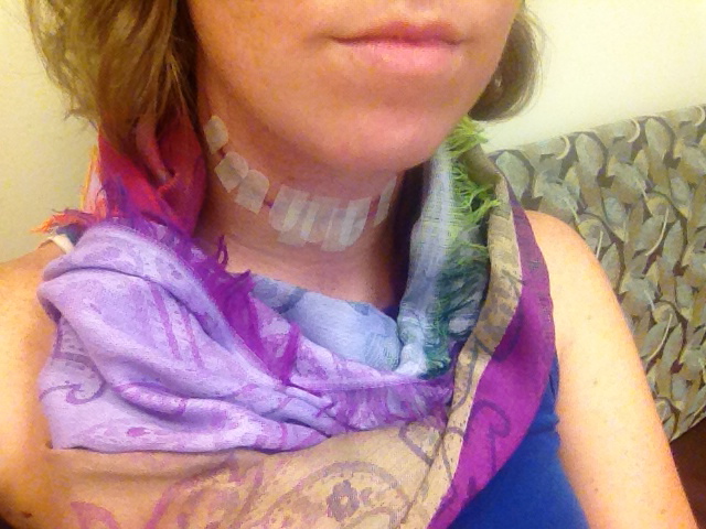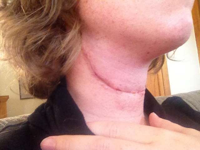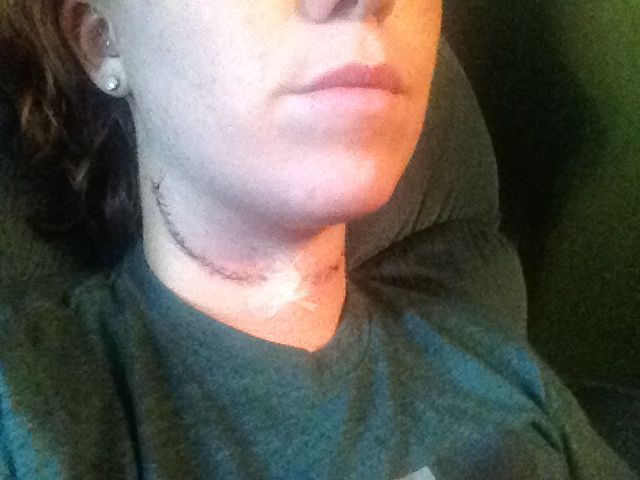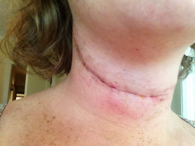 After my first surgery, they sent me home the second day with heavy bandaging on my neck and nothing else. This time, I went home after three days with no bandaging, and I had a drain in my neck for five days. While it was bizarre to have to drain a bottle of liquid from my neck several times a day, it is clear that my incision is healing much better and with a much slimmer line than last time. It was also much more comfortable not having thick bandaging to deal with.